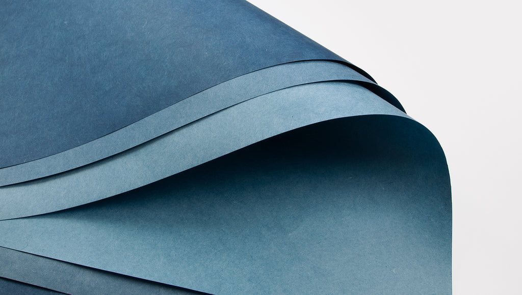 耐光性の高い染料で、靭皮繊維である楮(kozo)とフィリピン雁皮(Philippine gampi)を藍色に染め、ゆっくりと抄き上げた機械抄き和紙です。