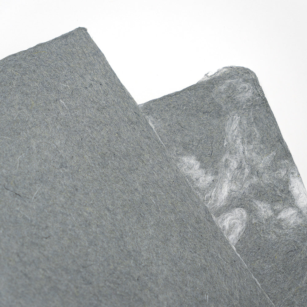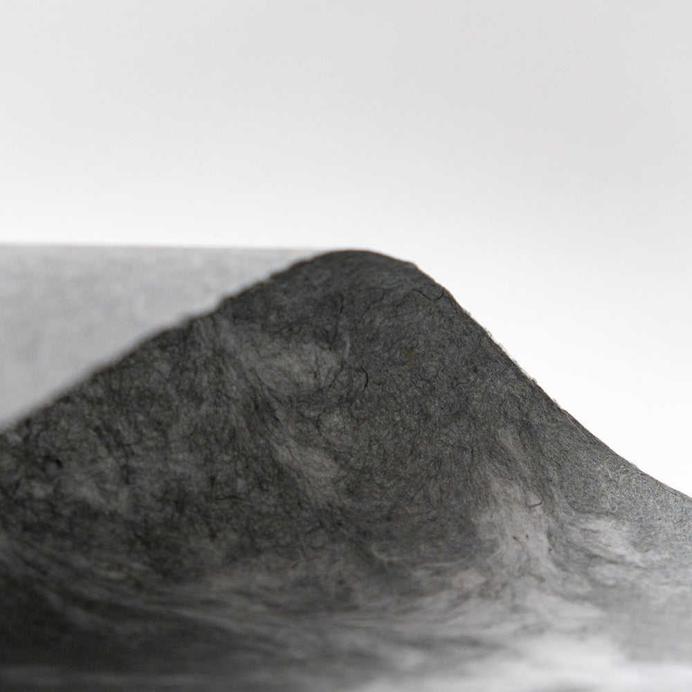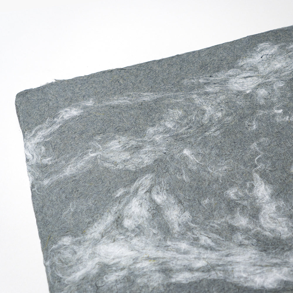 伝統的な手漉き和紙に、独自の技法で現代的な彩りを添えました。染め上げた繊維が水の中で混ざり合い、その瞬間の動きを一枚の紙に綴じ込めています。