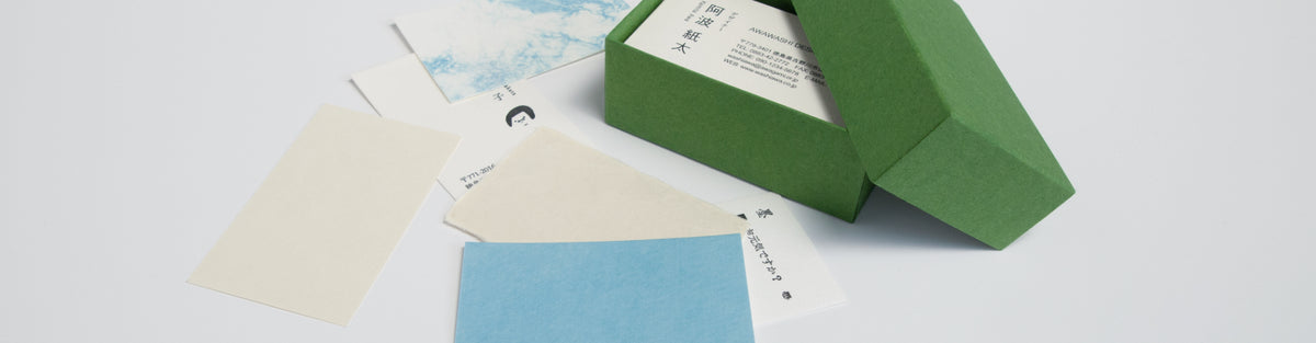 阿波藍で手染めした名刺です。もみ加工した和紙にムラ染めしました。裏面は白い無地の和紙を貼り合わせています。