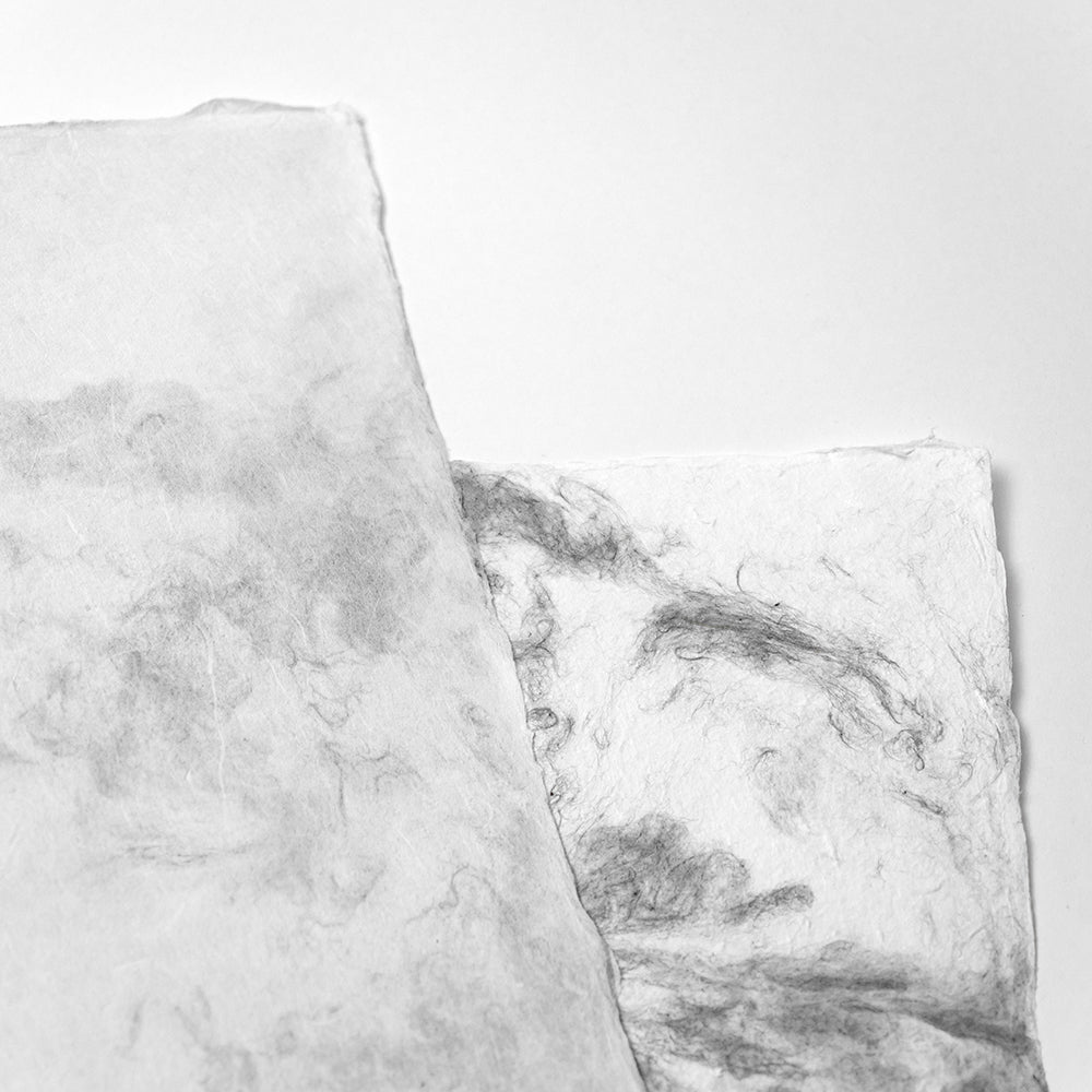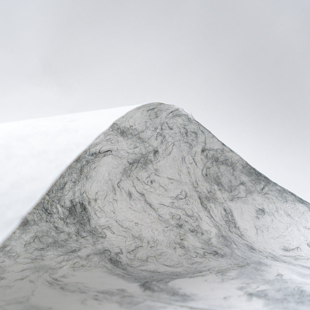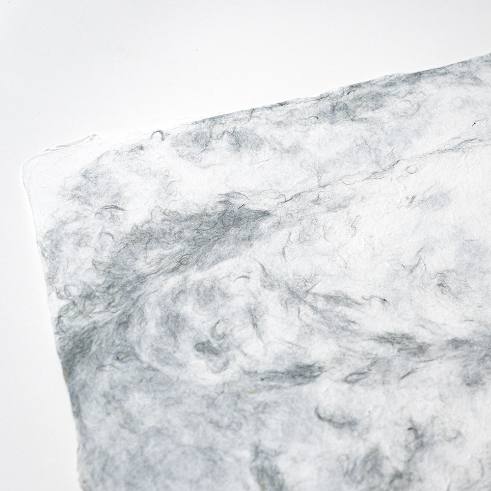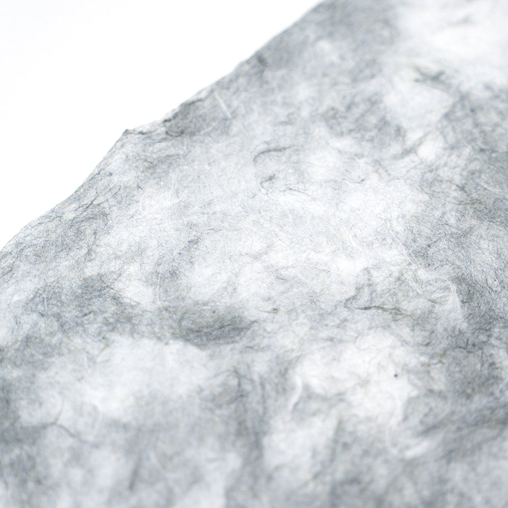 伝統的な手漉き和紙に、独自の技法で現代的な彩りを添えました。染め上げた繊維が水の中で混ざり合い、その瞬間の動きを一枚の紙に綴じ込めています。
